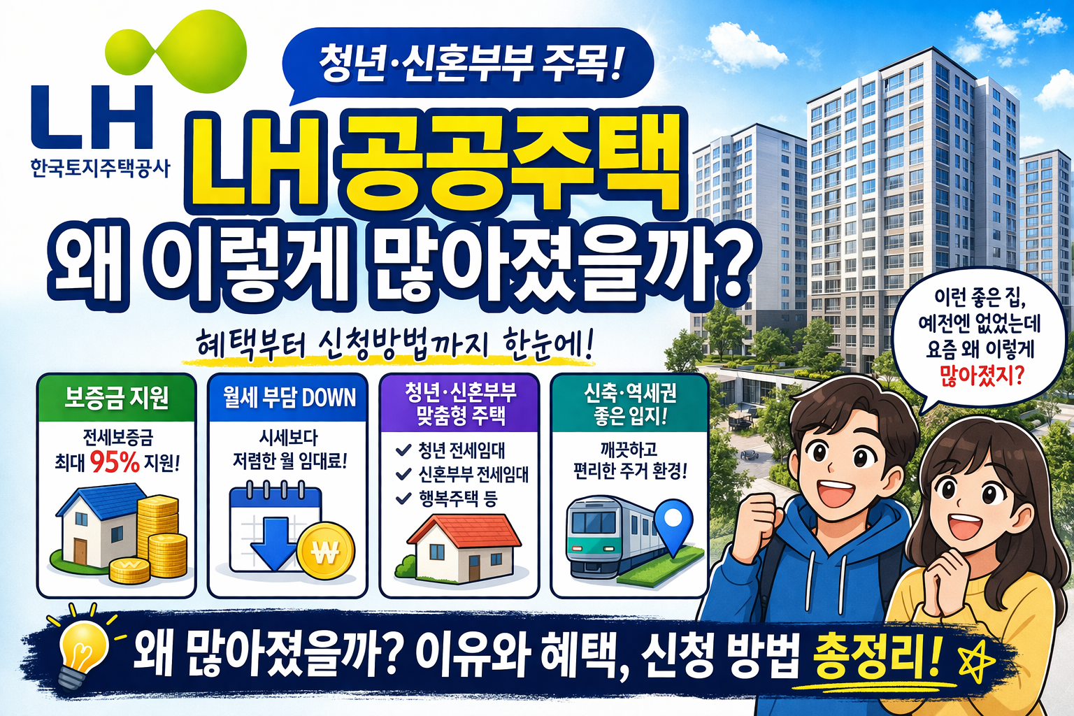 요즘 부동산 관련 정보를 찾아보다 보면 자주 등장하는 기관이 있다. 바로 LH다. 특히 청년 전세임대, 신혼부부 임대주택, 행복주택 같은 정책을 보면 대부분 LH가 공급하는 주택이다. 많은 사람들이 “요즘 LH 집 왜 이렇게 많지”, “청년 전세 지원 왜 이렇게 늘었지”, “예전에는 이런 집이 없었던 것 같은데 왜 지금은 많아졌을까” 같은 궁금증을 갖는다. 실제로 최근 몇 년 사이 LH 공공주택 공급이 크게 늘면서 청년과 신혼부부에게 제공되는 주거 지원 정책도 빠르게 확대됐다. 이번 글에서는 LH가 어떤 회사인지, 왜 이런 정책이 많아졌는지, 그리고 우리가 실제로 어떤 혜택을 받을 수 있는지 정리한다.
