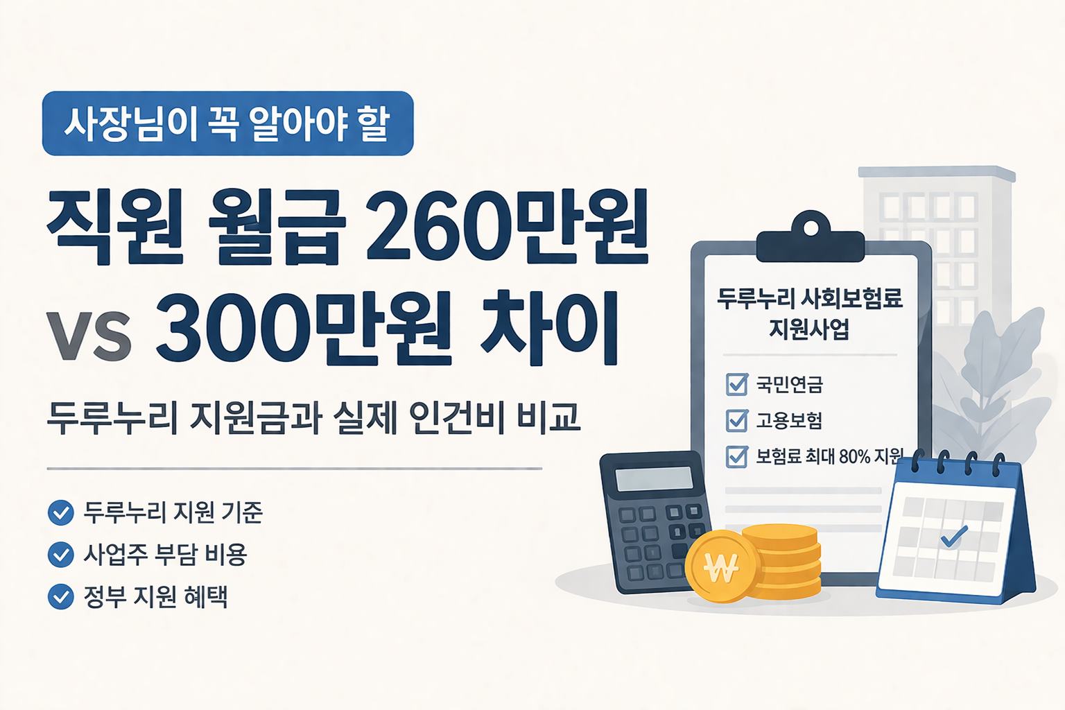 직원 월급이 260만원이면 두루누리 사회보험료 지원 가능성이 있고, 300만원이면 기준 초과로 지원 대상이 아니다. 그래서 급여 차이는 40만원이지만 실제 고용 비용 차이는 그보다 더 크게 느껴질 수 있다.