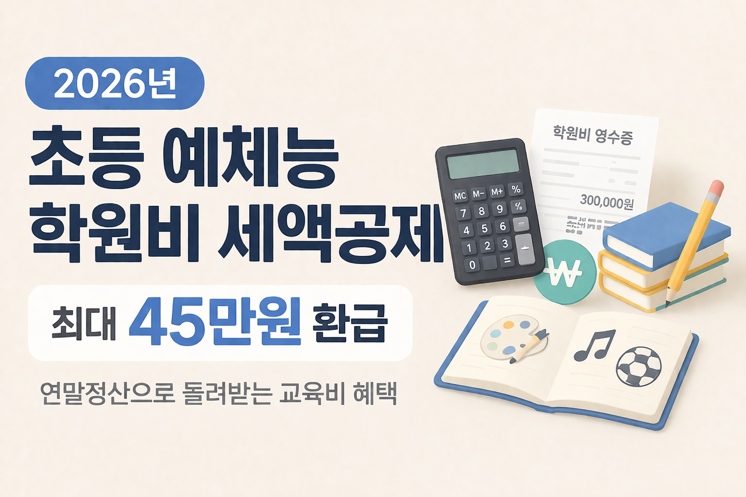 2026년부터 초등학교 저학년 자녀의 예체능 학원비는 연말정산에서 세액공제를 받을 수 있다. 연 300만원 한도, 공제율 15%로 최대 약 45만원까지 세금을 환급받을 수 있다. 다만 현금 지원금이 아니라 세금 환급 방식의 교육비 공제라는 점을 기억해야 한다.